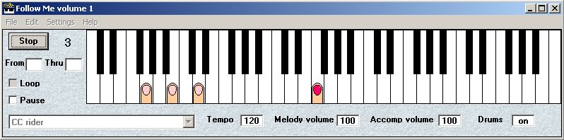 In the picture above the finger with the red nail is showing which key to play for the melody and the other three fingers are playing the chords. There are 4 different chord fingering methods available for keyboard. You can adjust the tempo and loop the part of the song that you are practising. Or pause the song an step thru melody notes or chords, one by one.